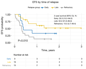 Initial disease characteristics, first-line chemotherapy, and relapse metrics were retrospectively collected from electronic medical records, including relapse timing, number of salvage chemotherapy cycles, response to the salvage regimen, adverse events and outcomes of ASCT. Reported toxicities were also analyzed. Relapse was categorized as primarily refractory if it occurred within three months of the end of treatment or during therapy, early if it occurred between 3 and 12 months after therapy ended, or late if it occurred more than 12 months after therapy had ended (9). Information bias was reduced by using a standardized data collection form.