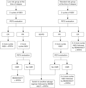 The IGEV regimen was administered in an inpatient setting, consisting of ifosfamide at 2,000 mg/m2/day infused over 24 hours (days 1–4), vinorelbine at 25 mg/m2/dose (days 1 and 5), gemcitabine at 800 mg/m2/day intravenously (IV) (days 1 and 4), and oral prednisolone at 100 mg/day (days 1–4). Anti-emetics were routinely administered; however, no prophylactic antimicrobial agents were provided to the patients, with the exception of trimethoprim/sulfamethoxazole. No specific dose modification guidelines were predefined prior to its administration. Subsequent cycles were administered after hematologic recovery. Peripheral blood stem cell (PBSC) harvesting was done after achieving remission (2–6 cycles) using subcutaneous filgrastim (10 mcg/kg/d), or filgrastim plus cyclophosphamide (2 gm/m2 IV over one hour). PBSC was deemed successful if the total CD34+ cell count was ≥2.5×106 cells/kg. The conditioning regimen used post-IGEV was BEAM consisting of bendamustine at 200 mg/m2/day IV on day −8 and day −7, etoposide at 200 mg/m2/day IV on days −6 to −3, cytarabine at 400 mg/m2/day IV on days −6 to −3, and melphalan at 140 mg/m2 on day −2 (8). Involved field radiotherapy (IFRT) was administered as a consolidation treatment for patients who underwent ASCT during the post-transplant period, as well as for those who were considered low-risk (LR) at the time of relapse (total dose 1,980 cGy in 11 fractions) to all sites initially involved at the time of relapse. The detailed treatment pathway is shown in Figure 1.