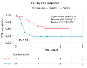 The total number of patients with relapsed or refractory HL during the period from August 2021 to December 2022 at CCHE was 44; 4 were excluded as they received ICE upon physician preference, the remaining 40 patients received IGEV as a second-line treatment following their first relapse. Most variables had complete data. Missing values were minimal and occurred in toxicity grading for only 2 patients. The patients’ characteristics at the initial presentation are listed in Table 1. The median age was 12 years (range 3–17 years). The male-to-female ratio was 1.3, and most patients exhibited nodular sclerosis (NS) pathology (80%). A significant percentage of patients presented with B symptoms (55%), bulky disease (45%), extranodal disease (47.5%), involvement of three or more nodal sites (85%), and advanced-stage disease (62%) at initial diagnosis. The EuroNet-PHL-C2 protocol was administered as the first-line treatment in 90% of patients, whereas the remaining 10% received the ABVD regimen (doxorubicin, bleomycin, vinblastine, and dacarbazine). Initially, only 25% of the cohort received radiotherapy due to having positive FDG PET-CT after the 1st 2 cycles of the frontline therapy. Among the 40 cases studied, 16 (40%) experienced late relapse, 15 (37.5%) presented with primary refractory disease, and 9 (22.5%) experienced early relapse. All relapses were confirmed by biopsy and occurred at the same sites of the initial disease involvement. The IGEV regimen was administered to patients as the first salvage therapy, followed by ASCT for those who exhibited a response to the treatment and met the criteria for transplantation. The ORR to IGEV regimen before ASCT was 70%, with 17 patients (42.5%) achieving CR and 11 patients (27.5%) exhibiting PR after two cycles of chemotherapy. Furthermore, five patients (12.5%) demonstrated SD, whereas the remaining seven patients (17.5%) displayed PD, demonstrated on FDG PET-CT following two cycles of treatment. The characteristics of patients who achieved CR or PR after 2 cycles of IGEV in comparison with those who had SD or PD are listed in Table 2. Out of the 28 patients who had good ORR after the 1st 2 cycles of IGEV, either CR or PR, 14 patients (50%) unfortunately experienced a second relapse while waiting for apheresis or transplantation. For these patients, the average duration from achieving CR to disease progression during the waiting period was 5.5 months (range: 1.5–14.2 months). Among the 24 patients who underwent ASCT in our study, seven achieved CR or PR with the IGEV regimen and subsequently underwent successful CD34+ stem cell mobilization followed by ASCT. The remaining 17 patients required a switch to an alternative chemotherapy regimen due to a second relapse prior to ASCT. In the subgroup of seven patients who proceeded to ASCT after IGEV, stem cell collection was completed after one apheresis session in four patients and after two sessions in the remaining three. Regarding the timing of stem cell collection, it was performed after the third cycle of IGEV in one patient, after the fourth cycle in two patients, and after the sixth cycle in four patients, as shown in Table 3. The median CD34+ cell yield among these seven patients was 5.8×106 cells/kg (range, 2.9×106–12.8×106 cells/kg), collected after a median of seven days following the administration of subcutaneous filgrastim alone or in combination with cyclophosphamide. Engraftment occurred at a median of 17 days (range, 12–26 days) following stem cell reinfusion. Patients who were classified as having low-risk at relapse (6 patients) were not indicated for transplantation as they had late relapse, did not receive radiotherapy during the front-line treatment, and achieved CR after 2 cycles of IGEV chemotherapy. Patients who had stable or PD following 2 cycles of IGEV (12 patients) were switched to another salvage regimen to achieve CR. Patients’ characteristics, at initial presentation, relapse, response to IGEV and outcome are listed in Table S2. The median follow-up duration for the entire cohort was 37.5 months [range: 10–96 months; interquartile range (IQR): 29–50.5 months]. The 2-year OS and EFS for our cohort were 86% and 34%, respectively, as shown in Figure 2. During the study, three children died. Two of the deaths were due to respiratory failure secondary to measles infection. Both patients had been vaccinated prior to their initial cancer diagnosis; however, their immunocompromised status following intensive chemotherapy may have contributed to their susceptibility and the severity of the infection. The third patient died due to PD. The 2-year EFS for patients with negative and positive PET-CT after two cycles of IGEV chemotherapy were 49.9% and 21.7%, respectively (P=0.01), as demonstrated in Figure 3. A statistically significant difference was observed in EFS regarding the timing of relapse. The 2-year EFS rates were 52.2%, 33.3%, and 13.3% for patients with late, early relapses and refractory disease, respectively (P=0.010), as shown in Figure 4. Figure 5 provides an overview of patient responses to the IGEV regimen, the number of patients who required alternative treatments, those who proceeded to ASCT, and the final outcomes across the study population. Adverse events were generally mild, with one patient experiencing a grade II allergic reaction to gemcitabine in the form of a skin rash. Only one patient required dose modification. This patient developed peripheral neuropathy, which led to the omission of vinorelbine from the fourth cycle of the IGEV regimen. In contrast, another patient who developed neurotoxicity due to ifosfamide, manifesting as seizures, was switched entirely to an alternative regimen (brentuximab-bendamustine). Furthermore, gemcitabine-induced pseudocellulitis was reported in two patients; it was diagnosed clinically but not confirmed histologically and it does not recur with subsequent gemcitabine doses. It was managed with s