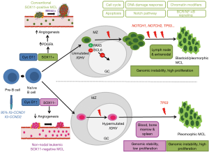 The initial oncogenic event in MCL is the t(11;14)(q13;q32) translocation that is acquired in immature pre-B cells in the bone marrow. However, the full oncogenic potential of this aberration seems to develop in mature B-cells that tend to grow in the mantle zone area of secondary lymphoid follicles. This peripheral B-cell may follow two different molecular pathways, which configure two distinctive clinical and biological subtypes of the disease (15,18) (Figure 1). The most common subtype of MCL is the cMCL, this subtype of MCL expresses the transcription factor SOX11 and originates in a B-cell that has not been exposed to the germinal center microenvironment. These tumors have no or have very low number of IGHV somatic mutations and maintain an epigenetic methylation signature reminiscent of naïve B-cells (naïve-like). This subtype develops increasing chromosomal instability with high number of chromosomal aberrations, and accumulate additional oncogenic events targeting cell cycle and DNA damage related genes. Clinically, these tumors develop generalized lymphadenopathy and usually have an aggressive clinical course. The nnMCL derives from a cell, which has experienced the germinal center and, consequently, they have high number of IGHV somatic mutations and maintain a methylation signature of memory B-cells (memory-like). These tumors also carry stable karyotypes, are SOX11-negative and clinically present with leukemic disease and frequent splenomegaly but nodal involvement is minimal or absent. The clinical course may be indolent for long periods although eventually some tumors progress with more aggressive behavior (1,7,20-22). Although the two MCL subtypes originates from mature B-cells at different stages of differentiation, the bias in IG gene usage and the presence of IG-stereotyped sequences in 10% of the cases indicate the influence of antigen selection in the clonal expansion of tumor cells in both subtypes of MCL (7,23).