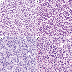 More aggressive MCL include two cytological variants, blastoid and pleomorphic (29). The tumor cells in the blastoid MCL have a medium size, with rounded nuclei, finely dispersed chromatin, inconspicuous nucleoli and scant cytoplasm resembling lymphoblastic lymphoma or acute myeloid leukemias (29,30) (Figure 2C). Pleomorphic MCL is composed of a heterogeneous population of large atypical cells with ovoid or irregular, cleaved nuclei, finely dispersed chromatin and small, distinct nucleoli (31,32) (Figure 2D). MCL with pleomorphic morphology may be misdiagnosed as diffuse large B cell lymphoma (DLBCL). However, in contrast to DLBCL, pleomorphic MCL cells may have irregular nuclear contours with finely dispersed chromatin, and certain discordance between the large nuclei and relatively small nucleoli is characteristic. Ancillary studies are needed to establish the correct diagnosis. Pleomorphic and blastoid variants share the high proliferation index and the aggressive clinical course (33). WHO classification recommends distinguishing both variants based only on the morphologic features, while identification of high proliferation is not enough to classify a case as blastoid or pleomorphic since some cases of classical MCL can have high proliferation index by Ki67 (34,35). When both classic and blastoid features are identified, it is recommended reporting both cytological variants and classifying these lymphomas as blastoid or pleomorphic subtype (29). The growth pattern of blastoid and pleomorphic variants is typically diffuse, more rarely nodular or mantle zone pattern. An “in situ” pattern of blastoid or pleomorphic MCL has not yet been described (36).